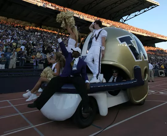 Though the car never made the trip to Pasadena, it did find its way to Husky Stadium for the ensuing season. From that point forward, the helmet car made itself at home inside the stadium on game days. Driven by members of the Husky marching band, and adorned by both band and cheer team members, the car would celebrate UW scores by driving a lap around the track.