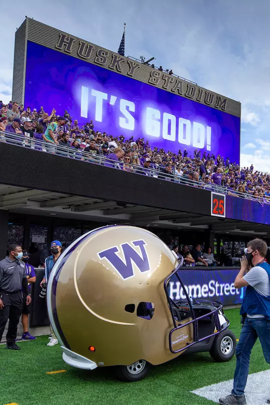 The Husky Helmet Car is back! Retired at the conclusion of the 2011 season with the renovation of Husky Stadium – and elimination of the track – the helmet car has been redesigned and reimagined for 2021 and beyond.